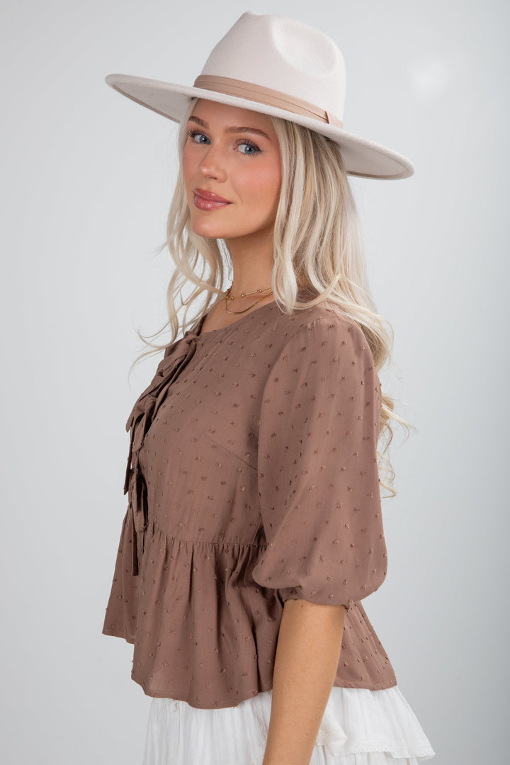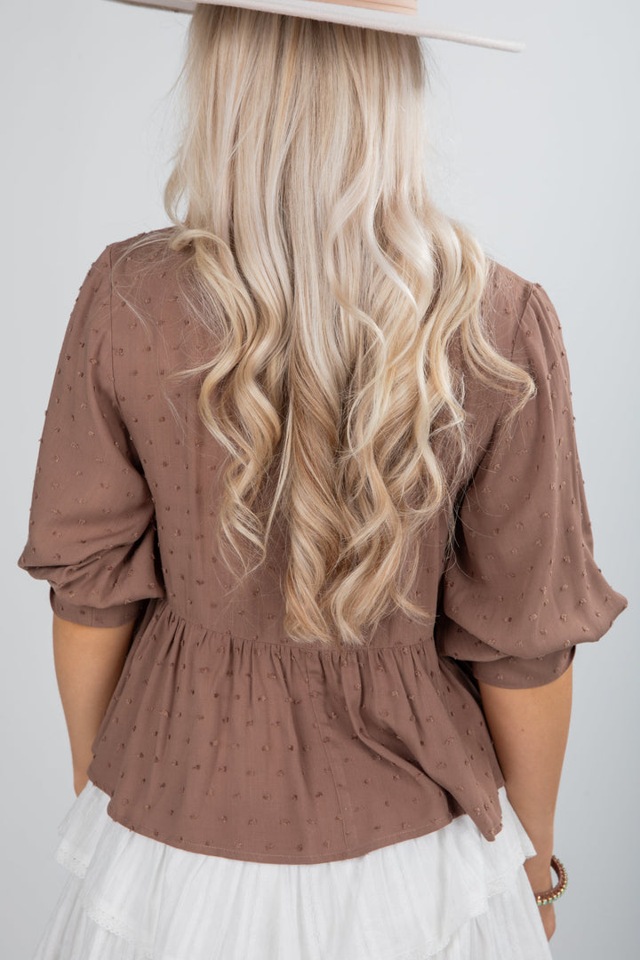 The Fall For Me Mocha Tie Blouse is a charming blend of sweet and chic! Designed with a delicate swiss dot texture, this blouse features a flattering peplum hem that adds a feminine touch. The front is finished with dainty bow tie details for an extra dose of charm, while the rich brown hue makes it perfect for transitioning through the seasons. Pair it with jeans for an elevated everyday look or style it with a skirt and heels for a dressier occasion!