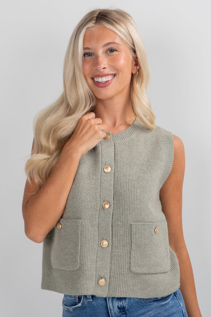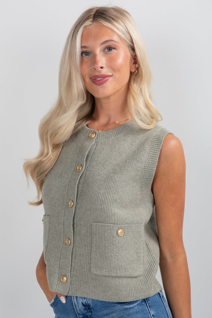The Just My Shade Sage Sweater Vest is a chic, modern layering piece with timeless appeal! Crafted in a soft knit, this vest features a sleeveless design and a classic button-up front accented with elegant gold buttons for a polished touch. The soothing sage hue adds a fresh pop of color, making it perfect for layering over blouses, turtlenecks, or dresses. Versatile and stylish, this sweater vest effortlessly elevates both casual and dressier looks!